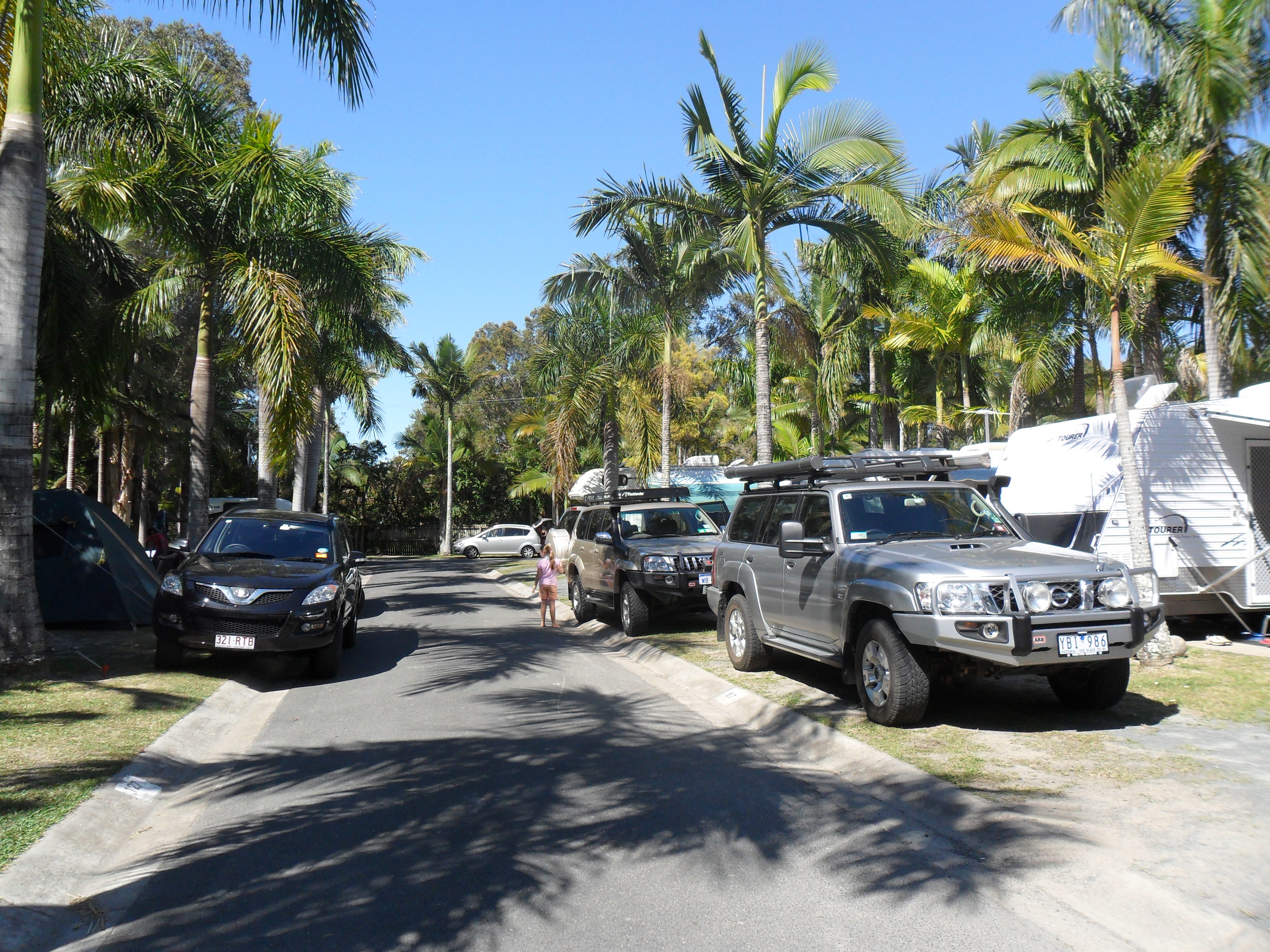 Noosa is basically a holiday resort and it is school holidays so the campsite is busy but, like all the other campsites we have stayed in, the facilities (kitchen, laundry, showers and loos) and excellent and the people friendly. Our little van looked a bit sad next to all the other huge tents and caravans, not to mention the great muscular massive-engined 4WD vehicles that everyone seems to drive (to pull their caravans, I guess…).