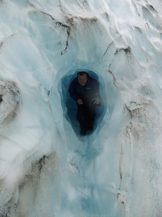 A word about crampons: they are bloody marvellous. The ice on the glacier is like oiled glass, there is no way you can grip onto it and walking on it would be impossible, but with crampons as promised by Tubs we ‘stuck to the ice like velcro’. Fantastic! With crampons and a pickaxe we could go pretty much anywhere as we could walk on most surfaces, and where it was too steep Tubs could cut steps: