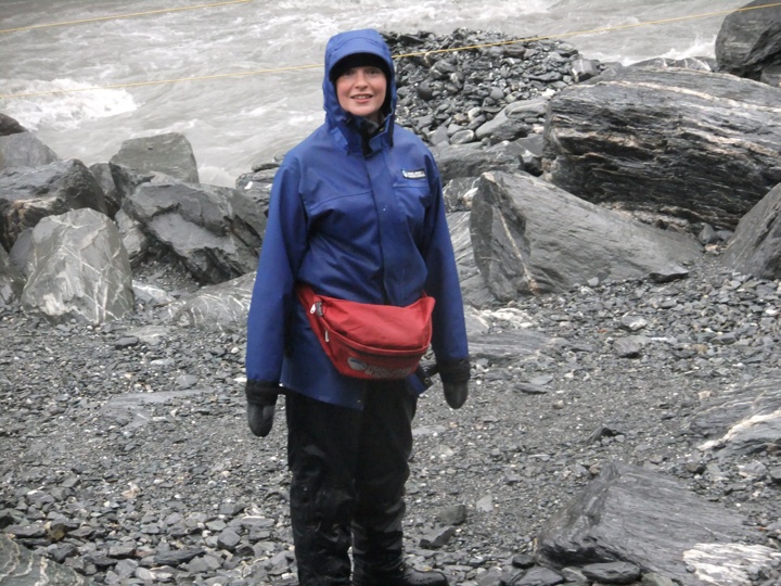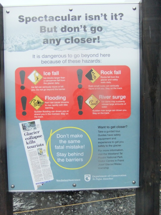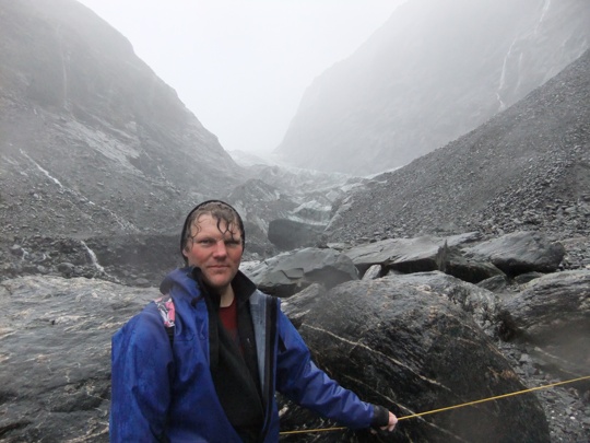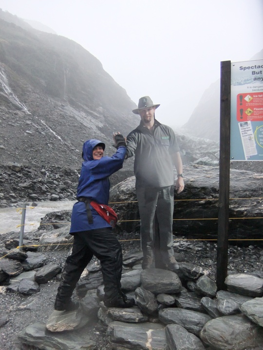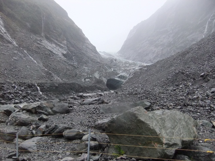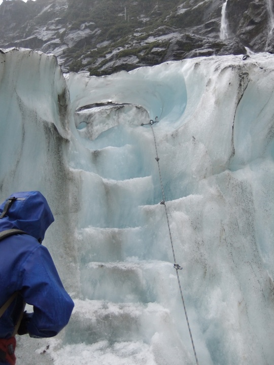On a freezing cold and wet morning we turned up at the Franz Josef Glacier Guides centre to get kitted out for the full day trip. We were issued with boots, socks, waterproofs and crampons and then bussed to the entrance to the glacier national park from where it was a half hour hike to the terminal face of the glacier: