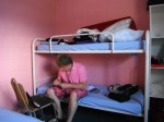 Randall was so fed up with sleeping in the camper van at this point that we ‘upgraded’ to a ‘cabin’ (double bed, bunk beds, small table & chairs) which turned out to be this charming pink colour:
