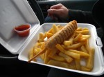 After a swim at the local pool in the afternoon it was fish and chips while sitting watching the lake (or hot dog and chips in Randall’s case):