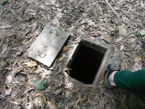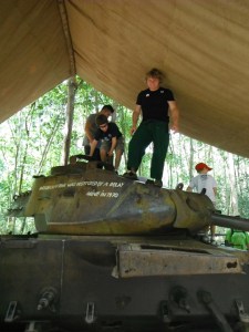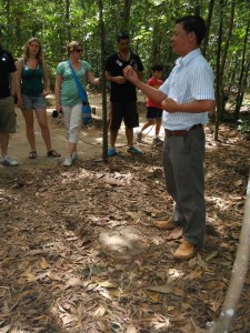The next day we took the inevitable tourist trip to the Cu Chi tunnels, one of a series of tunnel complexes used by the Viet Cong. The tourist attraction is based around some partially restored tunnels and a kind of walk-through open air museum with varying degrees of factual accuracy about the exhibits; our guide pointed out some waxworks of ‘Viet Cong’ wearing military fatigues and smoking above ground, both fairly unlikely occurrences. Still, the ‘walk through’ tunnel was pretty hairy – we did the minimum 20 metre stretch, although a couple of our group did the full 100m open to tourists, reappearing red, sweaty and very out of breath.