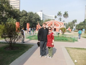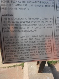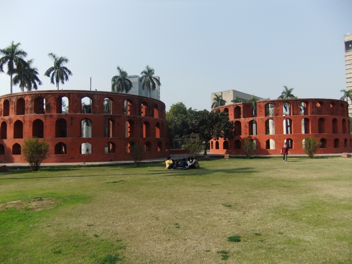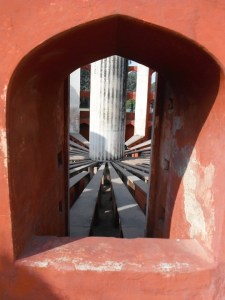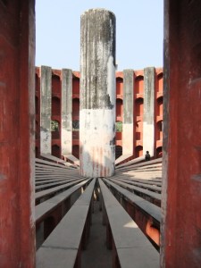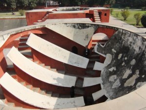 On Sunday morning we rose in time for breakfast in another rooftop cafe overlooking the bonkersness of Paharganj…auto-rickshaws, cycle-rickshaws, the odd car, the odd cow and people people people competing for space and attention. Then it was off in an auto-rickshaw to the Jantar Mantar – our rickshaw driver was quite mad; swerving up to other vehicles to shout at their occupants, but he made me laugh a LOT when we passed a small minibus with some naff western hippy hanging out of the window – all dirty dreads and grubby ‘I”m *spiritual* maaaaaaaan’ robes – and our driver practically pranged the bus so he could yell ‘NICE HAIR, MAN!!!’ at him before veering off across the traffic in the other direction. *Smirk*.