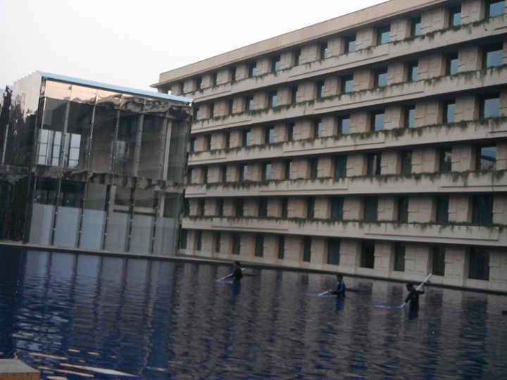 Hotel employees, wetsuited up, cleaning the bottom of the pool. Once the sun went down it was really cold so they must have been FREEZING!