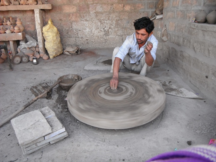 Potter throwing incredibly delicate pots and lids on a hand turned heavy stone wheel, turned with the stick on the left.