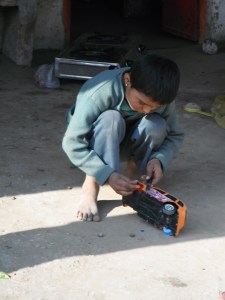Small child fixing the missing wheels on his toy car using bottle tops. Future mechanic or engineer?