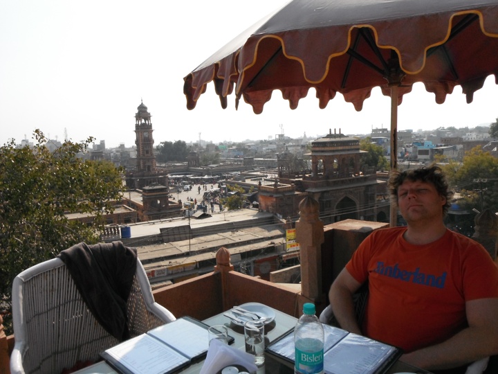 Overlooking the clocktower, central Jodhpur, at Indique, the rooftop restaurant at the Pal Haveli hotel.