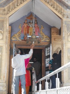 Ringing the bell of the temple at the top.