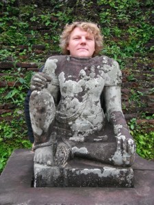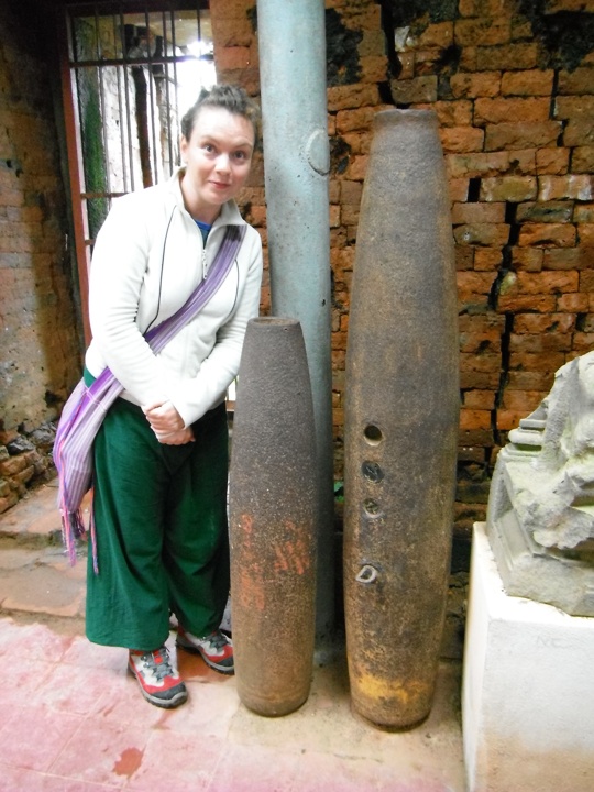Peering into a shell casing from the war – there was bombing and fighting around the temples, much destroyed, craters and bullet holes still evident.